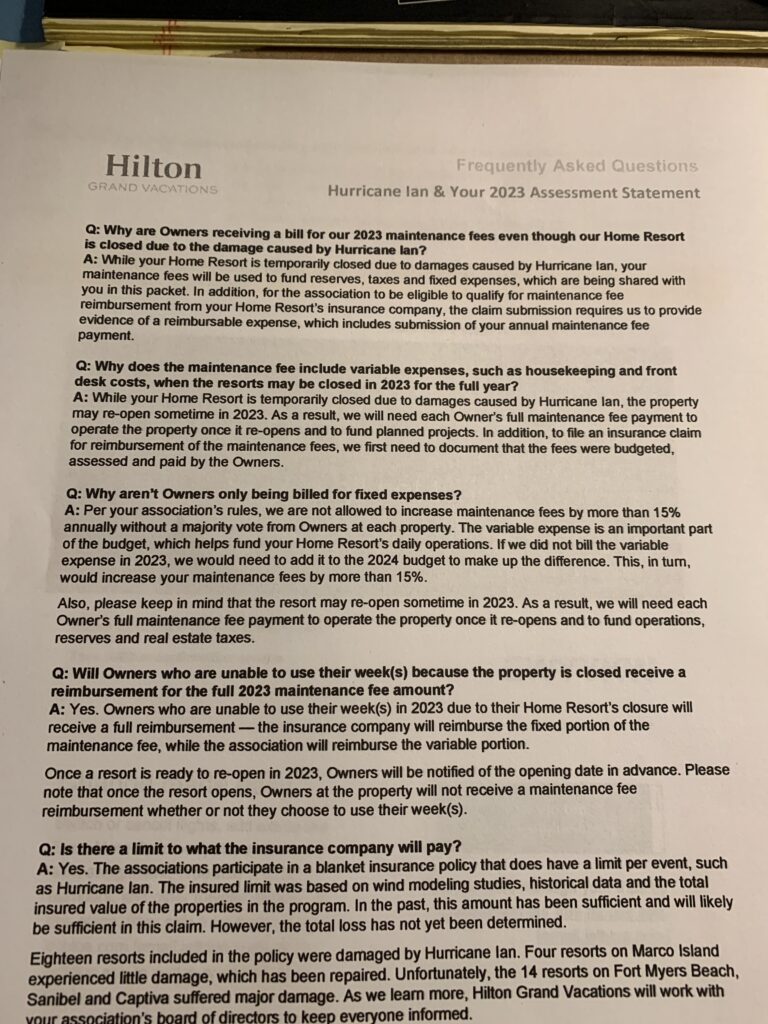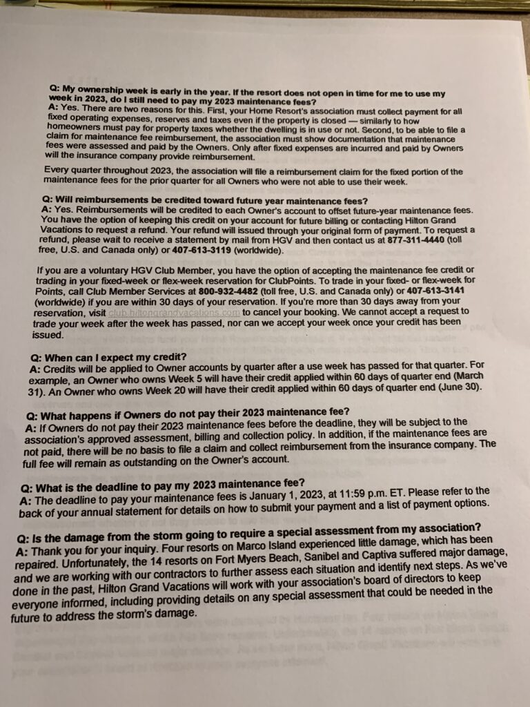 Good morning, as the first update to this site, I wanted to share some things with you. We are seeing a lot of comments about maintenance fees and the refunding of them. The HGV Questions and Answers should have answered these questions but it obvious that it is not clear to everyone. A lot of comments about “Hilton this, and Hilton that…” Hilton is our Management company and charges us a flat yearly fee to manage our property. They are not responsible to financially fund our properties operations, we are, as owners, via the Association. We are legally responsible under the Management Agreement to properly fund our property. This is why we are billing for 2023 maintenance fees. Some clarification on the reimbursement (crediting) of maintenance fees. Two things have to happen for maintenance fees to be eligible for reimbursement. First, your 2023 maintenance fees must be paid. For obvious reasons, fees that are not paid, are not reimbursed. Second, you must have actually lost the use of your unit. Because we do not currently know when the resort will re-open, your week must have actually been lost by resort closure. A guess that the resort will not be open does not qualify. Weeks lost in 2022 after the resort closed and 2023 weeks lost will be reimbursed to the owners. It is estimated that this will take up to 60 days after the close of each calendar quarter. So, for 2022 lost weeks, the expectation is that reimbursement should occur by February 28, 2023. Some of you have posted that you want your money refunded. There is a difference between reimbursement (a credit to your account) versus a refund, an actual refund of money to your original form of payment. The process of requesting a refund is outlined in the Q & A doc’s. One final thought, we have had requests for copies of our insurance policies. Because our unit owners are neither a named insured or additional insured under our insurance coverage, we, as owners, have no rights or responsibilities under our insurance policies. Below is the Q & A sheet for your reference. Thank you. Tim Pellerin